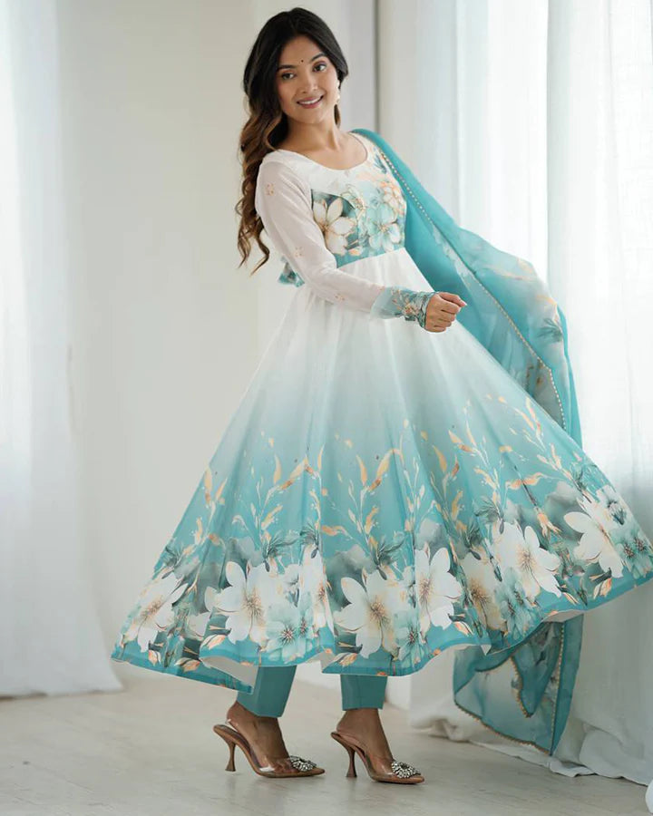Aqua Blue Floral Print Organza Three Piece Anarkali Suit