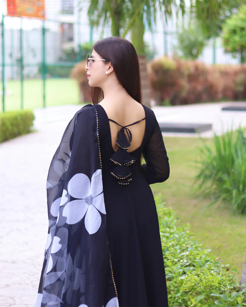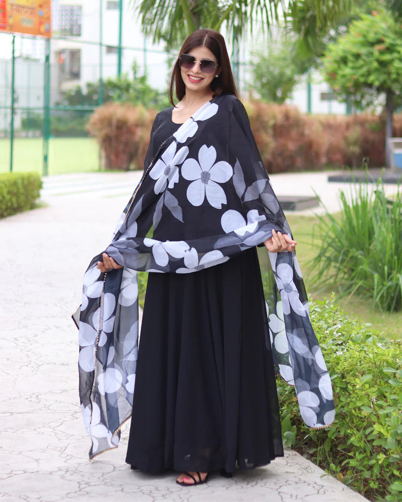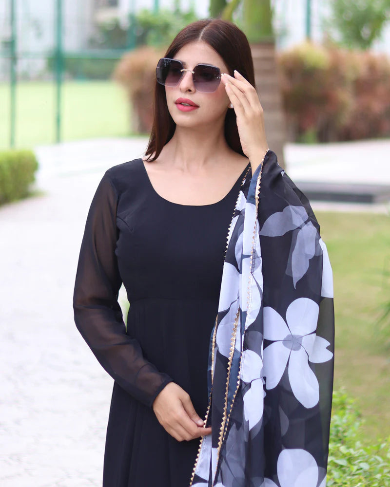 Black Color Soft Georgette Anarkali Gown With Floral Printed Dupatta