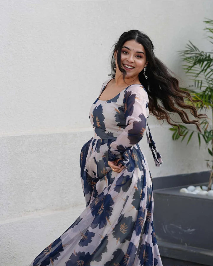 Blue Color Flower Print Tabby Organza Anarkali Suit