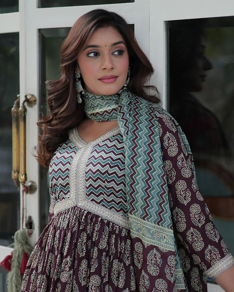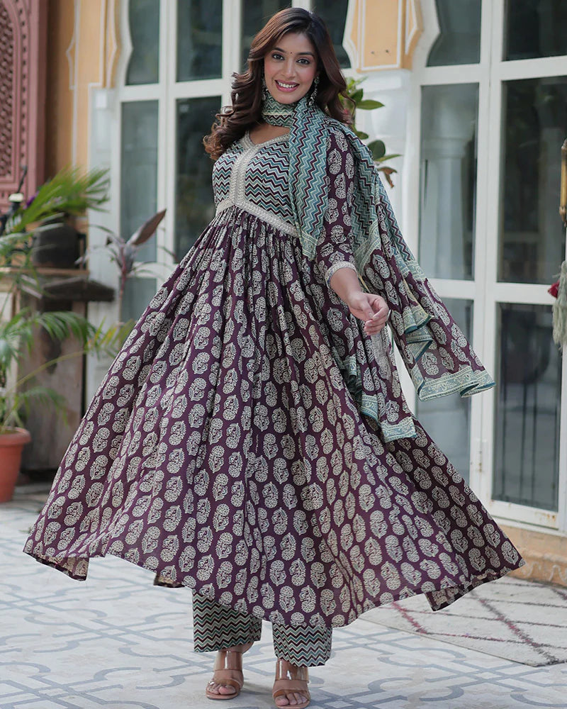 Coffee Brown Color Printed Pure Cotton Three Piece Kurti Suit