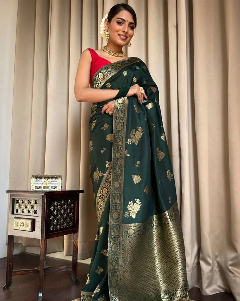 Dark Green Color Big Flower Design Banarasi Soft Silk Saree