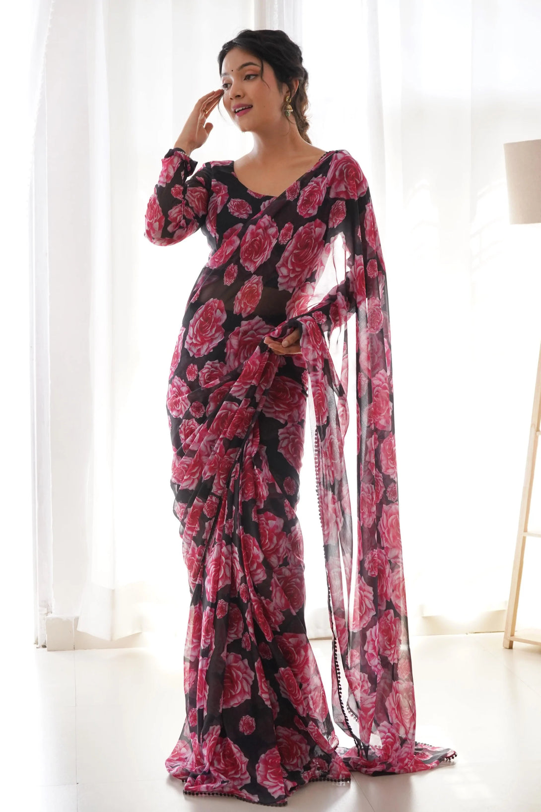 Elegant Black Chiffon Saree with Pink Flower Print and Full Sleeves Stitched Blouse