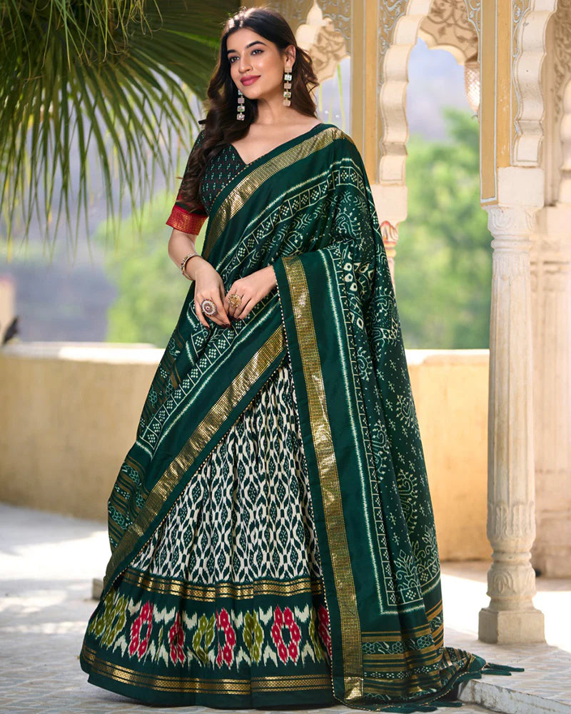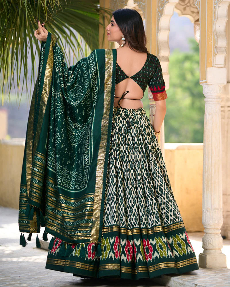 Green Color Tussar Silk Ikkat Printed Lehenga Choli