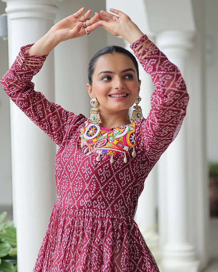 Maroon Bandhani Style Peplum Choli With Kora Cotton Lehenga
