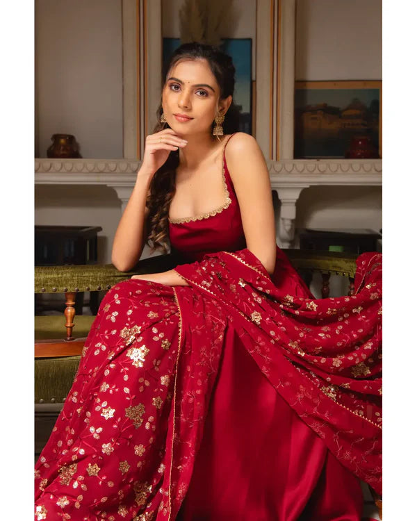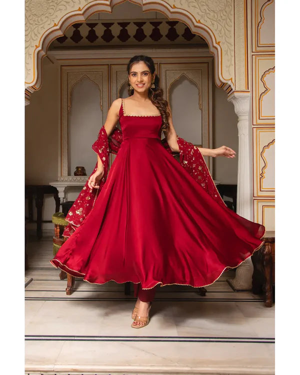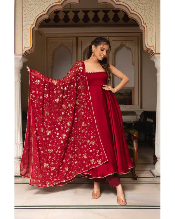 MAROON COLOR PARTY WEAR LOOK ANARKALI WITH BOTTOM AND DUPATTA
