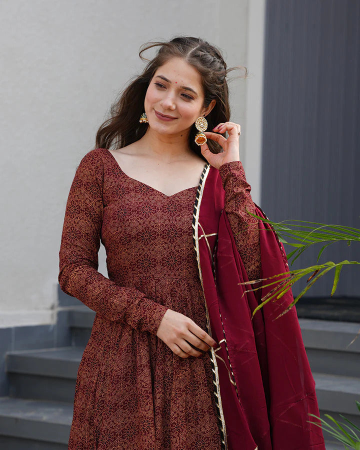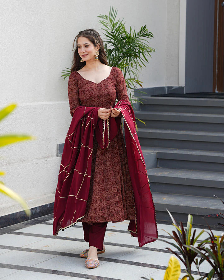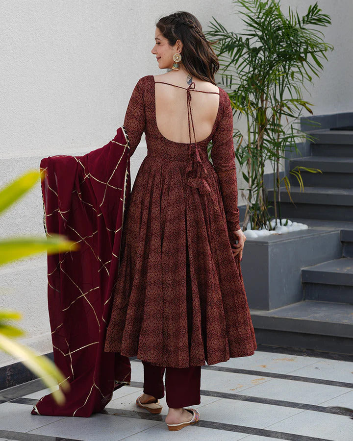 MAROON COLOR PURE COTTON AJRAKH PRINT ANARKALI SUIT