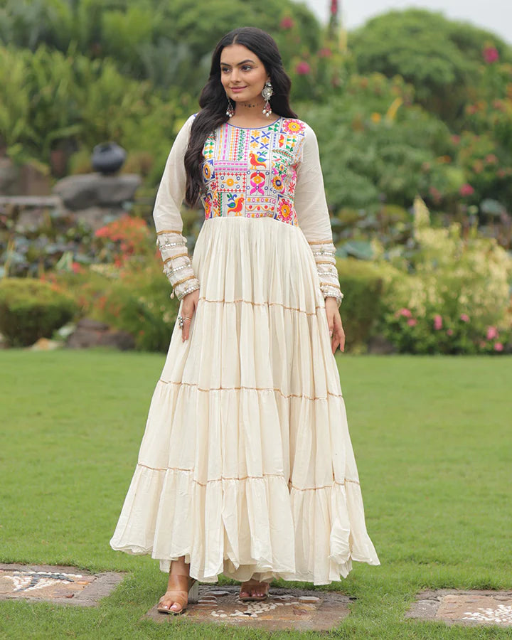Off-White Color Kora Cotton multi Threaded Navratri Gown