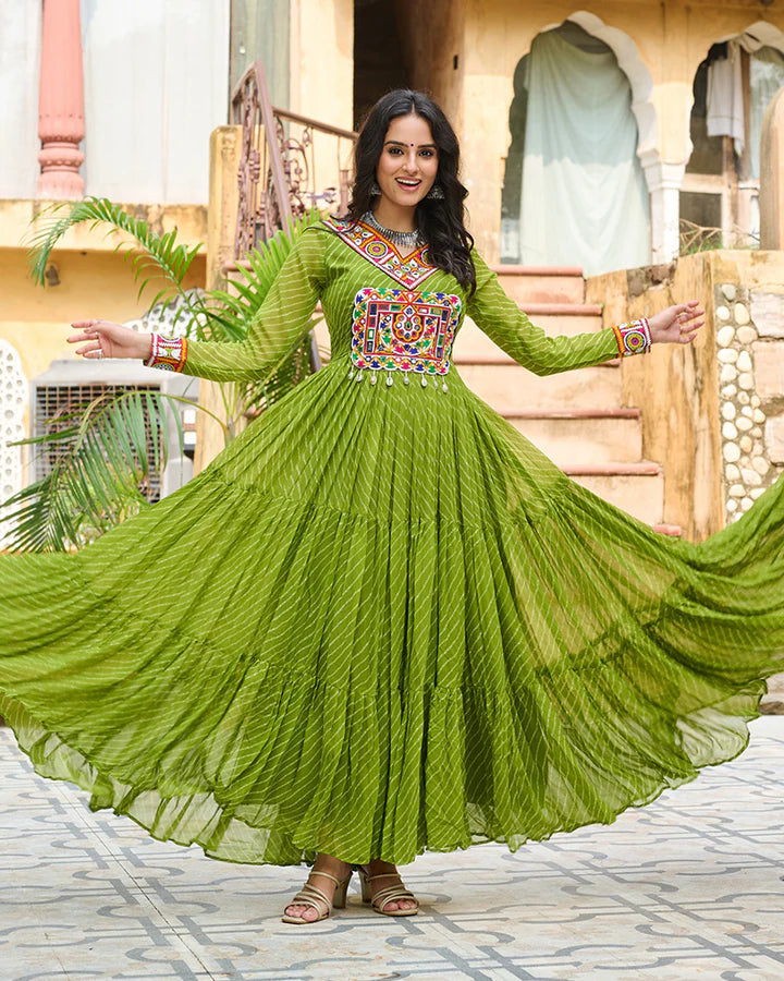Parrot Green Kutchi Work Laheriya Printed Anarkali Gown