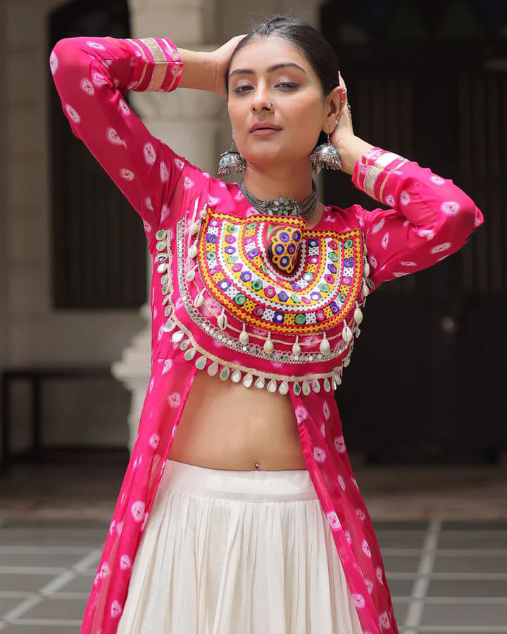 Pink Color Bandhani Print Kurti With Kora Cotton Lehenga