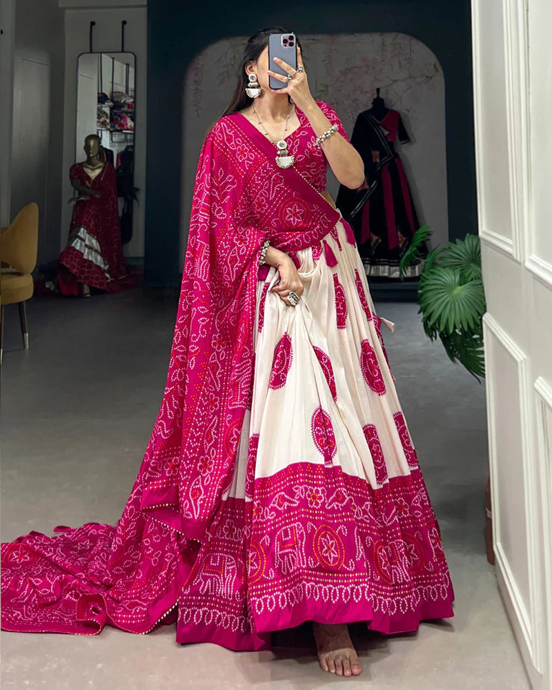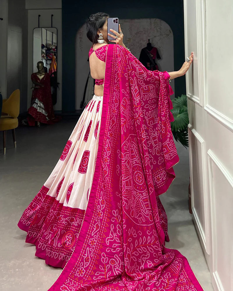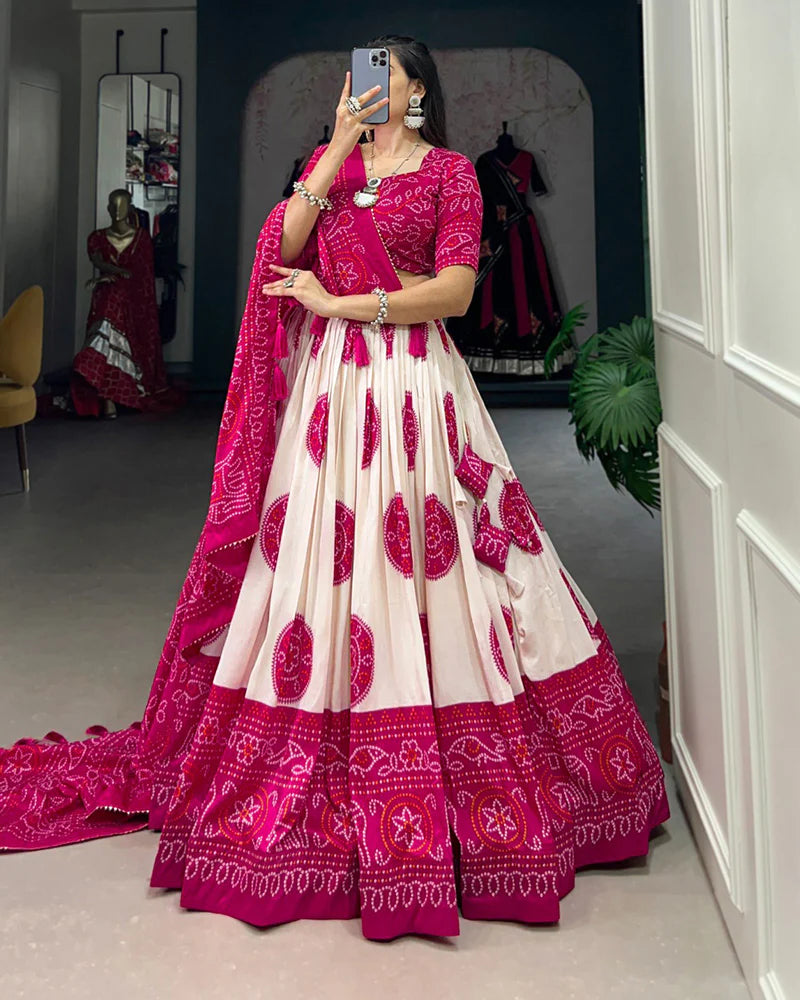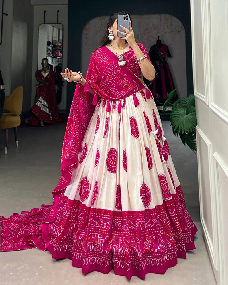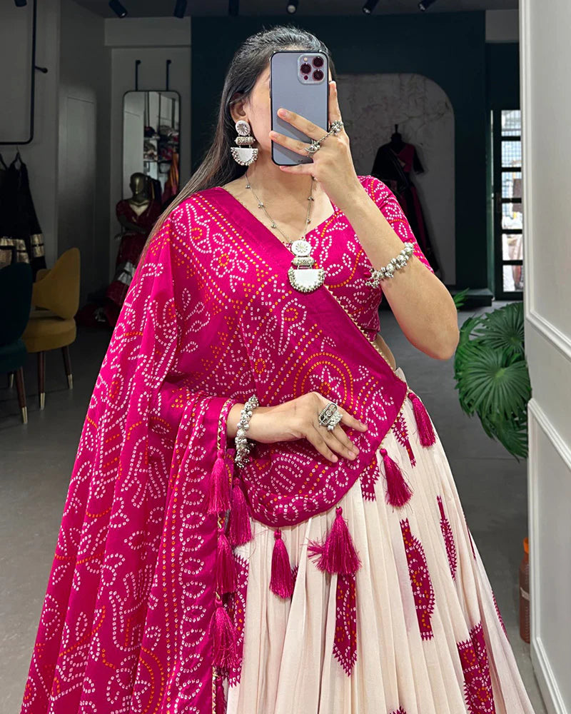 Pink Color Tussar Silk Bandhej Printed Lehenga Choli