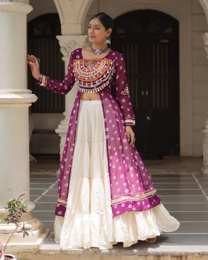 Purple Color Bandhani Print Kurti With Kora Cotton Lehenga