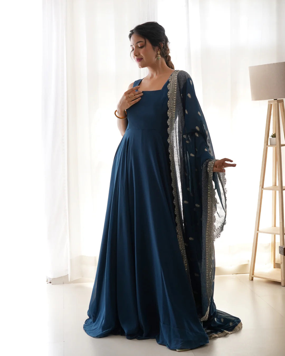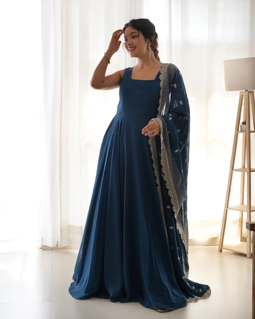 Rama Color Anarkali Gown With Heavy Embroidered Dupatta