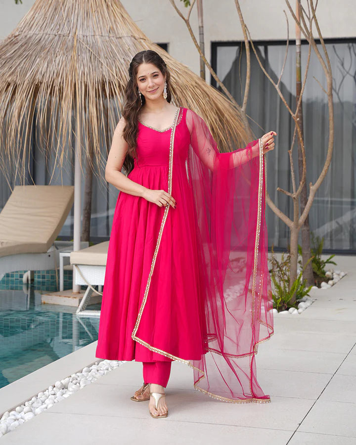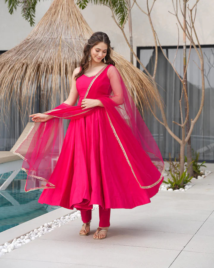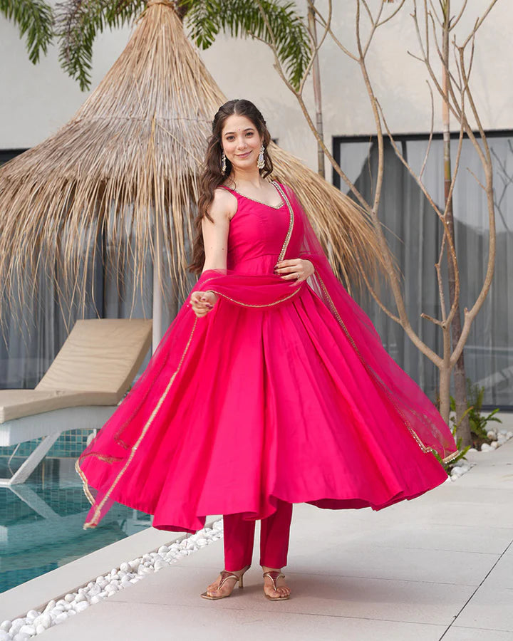 Rani Pink Color Chanderi Pure Roman Silk Anarkali Suit