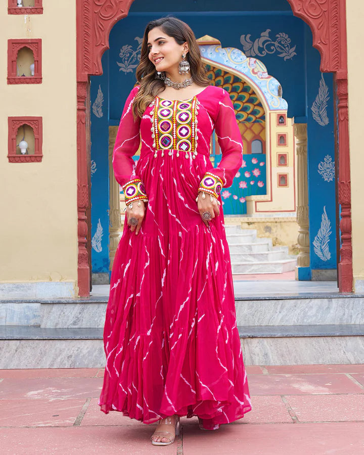 Rani Pink Color Georgette Laheriya Print Navratri Gown