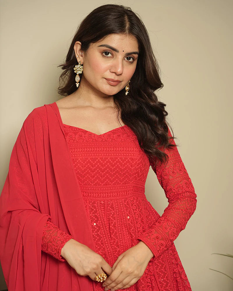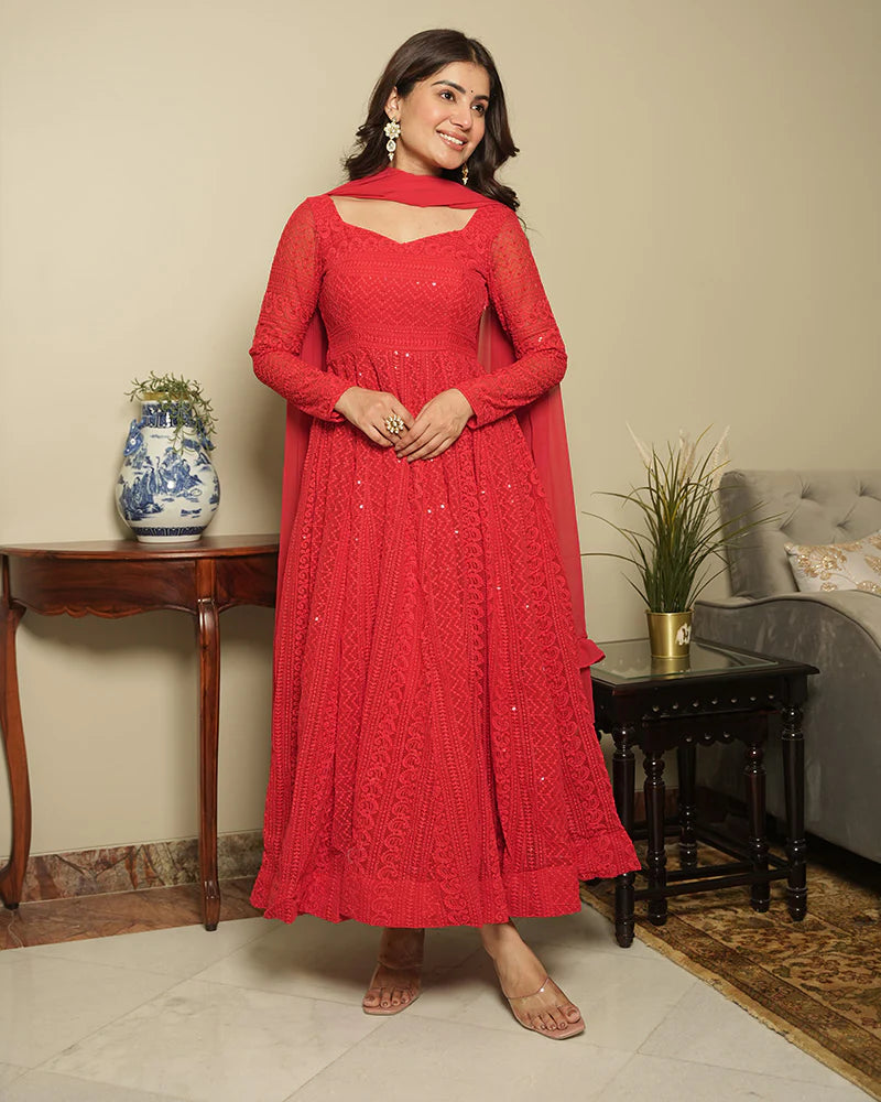 Red Color Georgette Lucknowi Three Piece Anarkali Suit