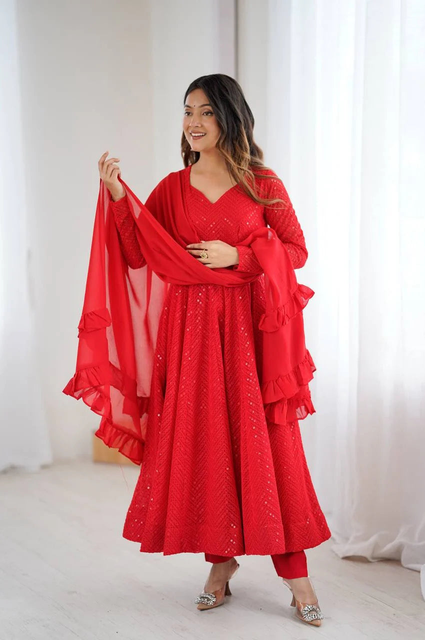 Red Color Lucknowi Work Anarkali Suit with Ruffle Dupatta