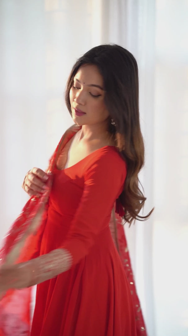 Red Color Soft Georgette Anarkali Gown With Heavy Embroidery Work Dupatta