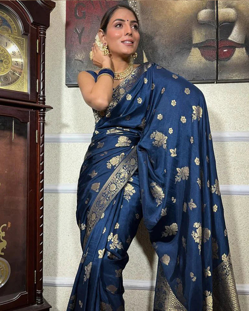 Royal Blue Color Big Flower Design Banarasi Soft Silk Saree