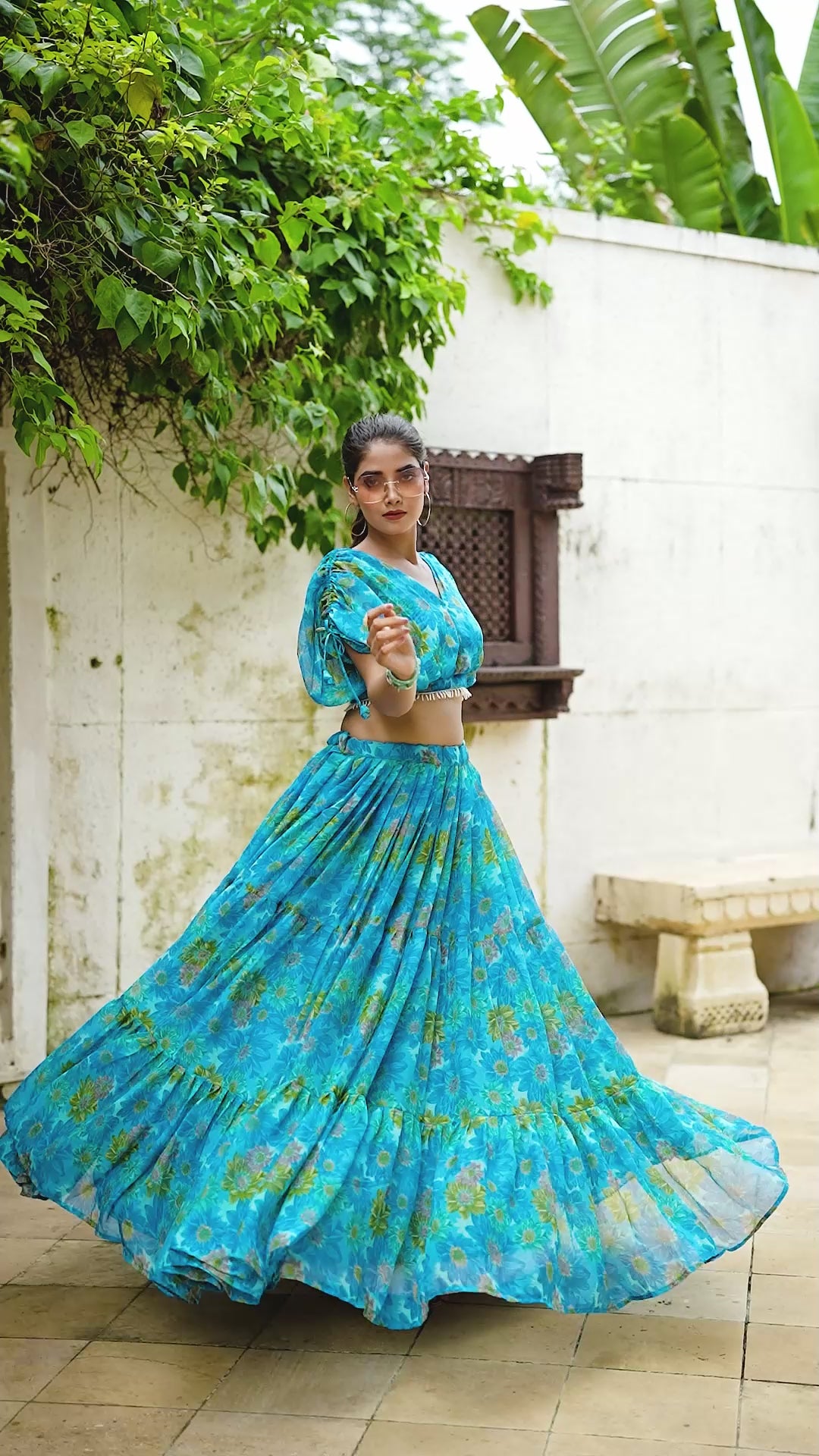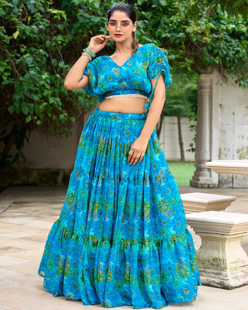 Sky Blue Color Chiffon Printed Crop Top Lehenga Choli