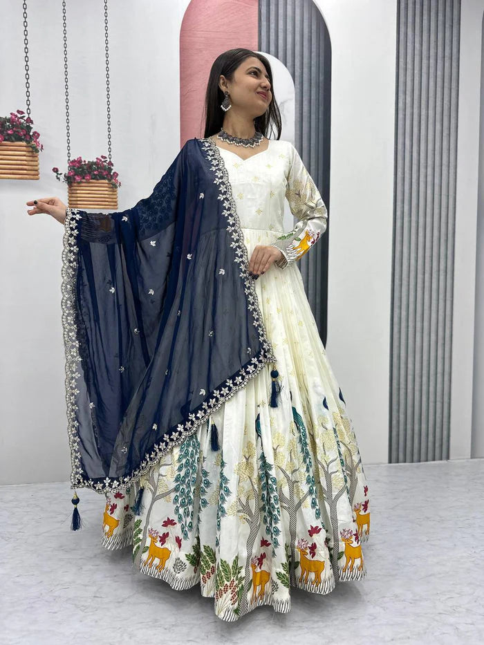 TRENDING PEACOCK DESIGN DOLA SILK BASE FOIL AND MILL PRINT WORK GOWN
