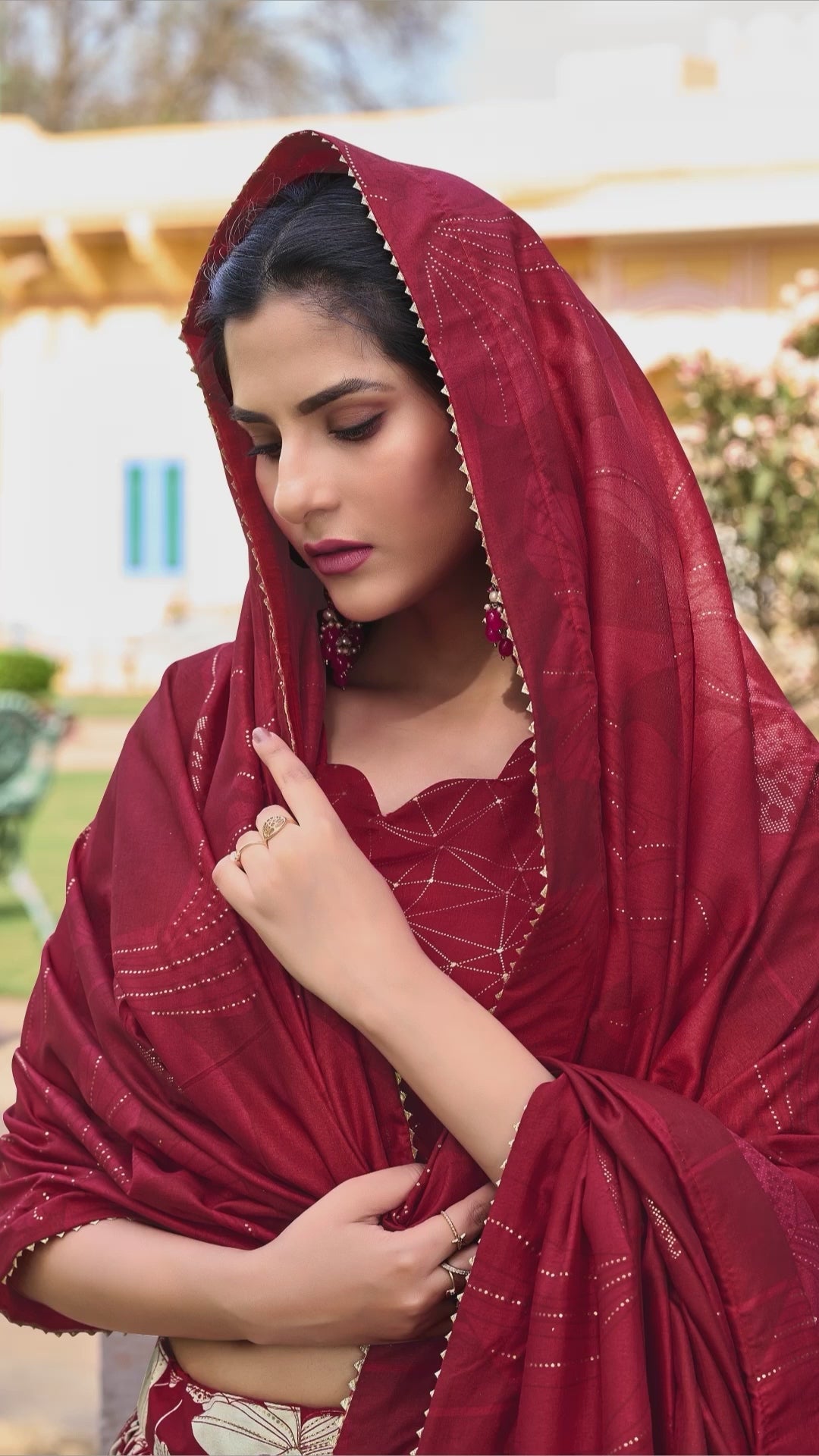 Tussar Silk Printed Lehenga Choli Red Colour with Duppta