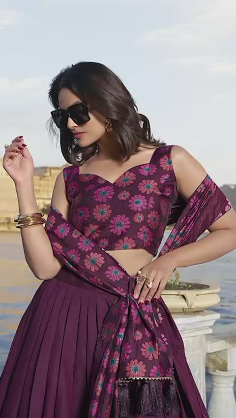 Tusser silk Floral Print With Foil Work Wine lehenga choli
