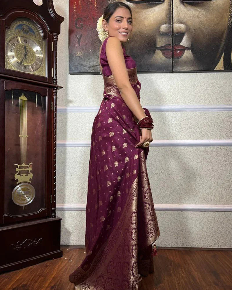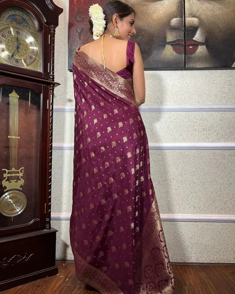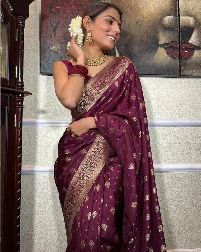 Wine Color Small Butti Design Banarasi Soft Silk Saree